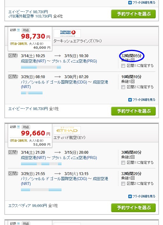 チェコは日本からの直行便がないので、乗り継ぎ便で探します。