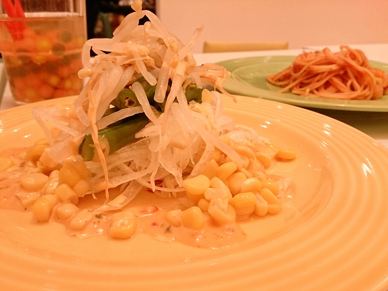 片隅にあるサラダとパスタしか食べられん。