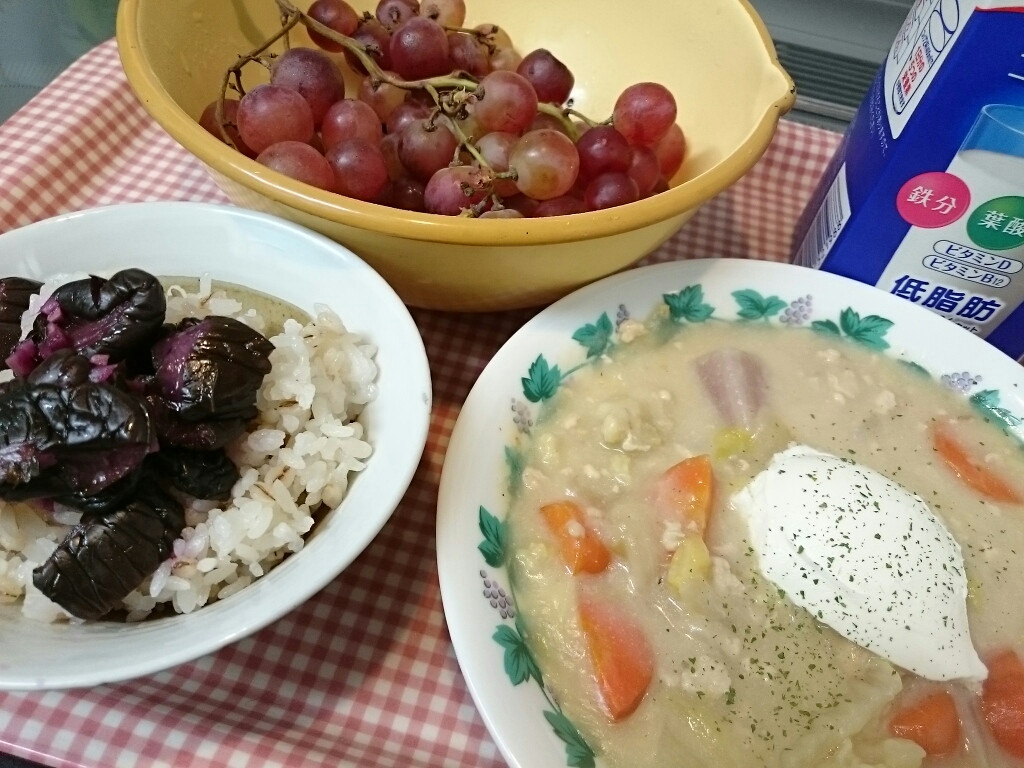 「昨日作ったシチューがたくさんあるので食べてください。ぶどうもあるので食後にどうぞ」