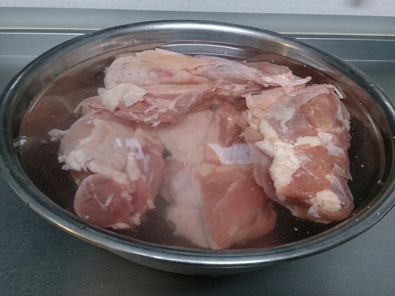 こういうカタマリ肉はどぼーんと常温の水に浸けておきます。