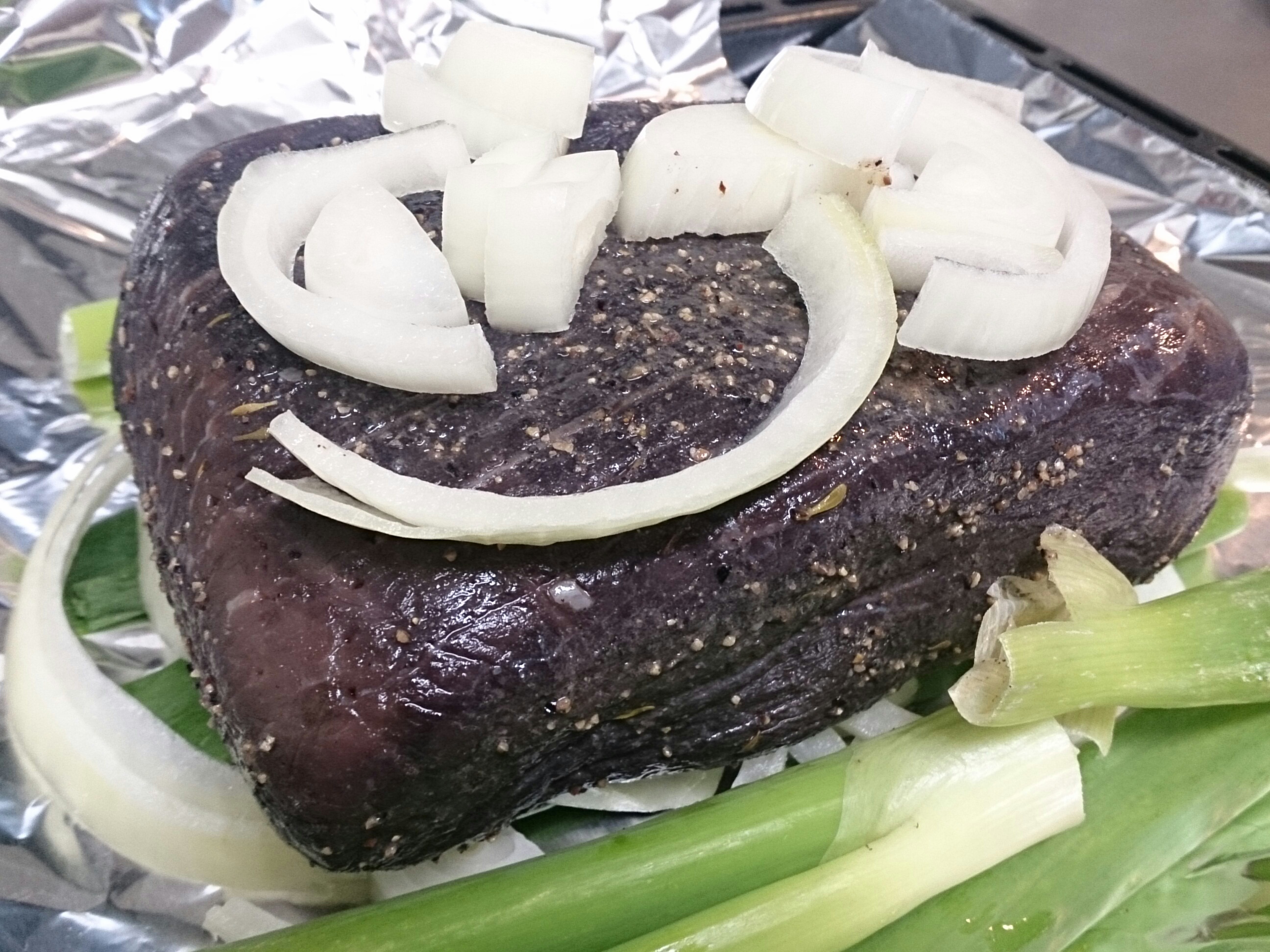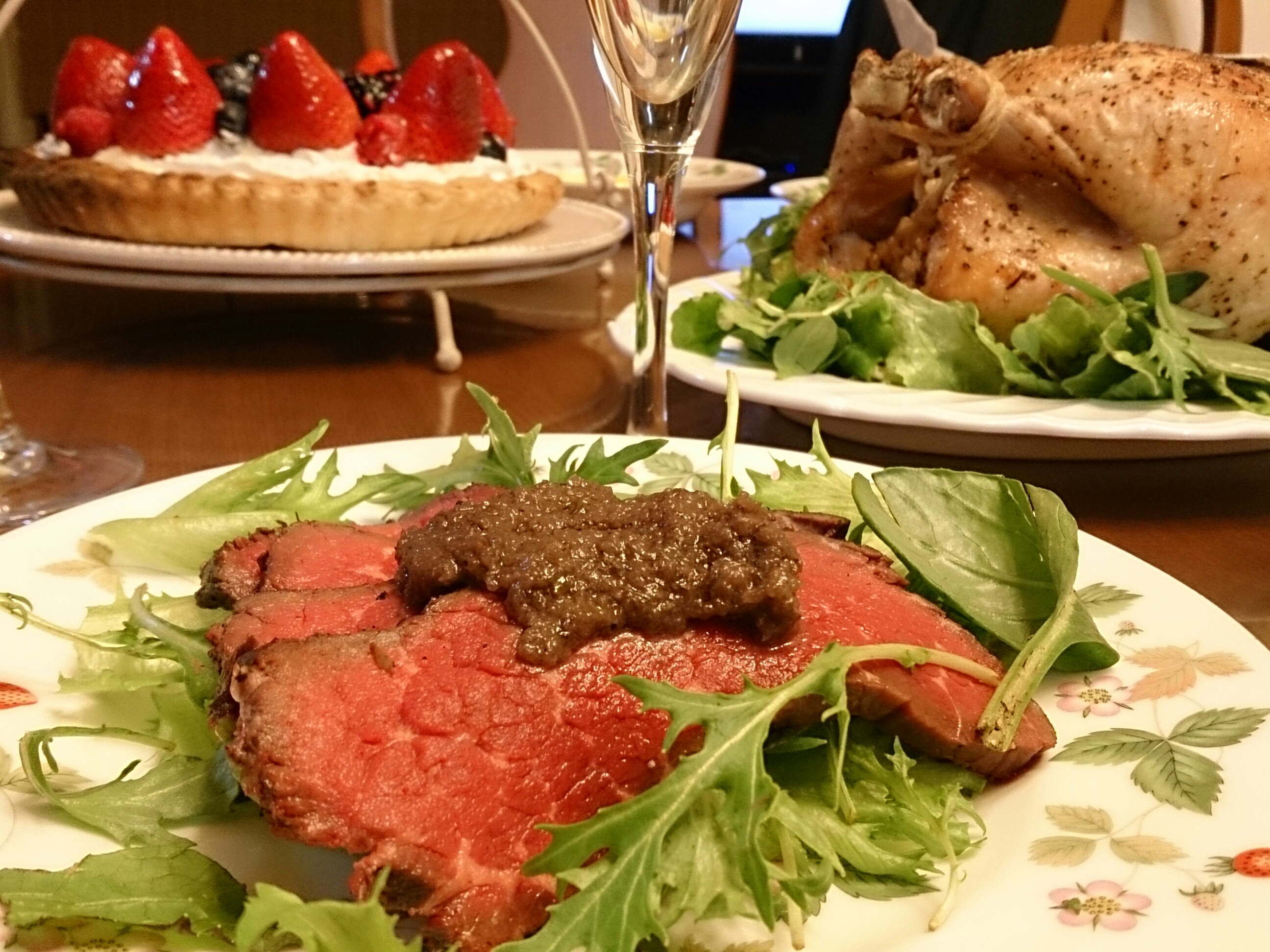 ローストビーフがいい具合にレアで焼けましたん。